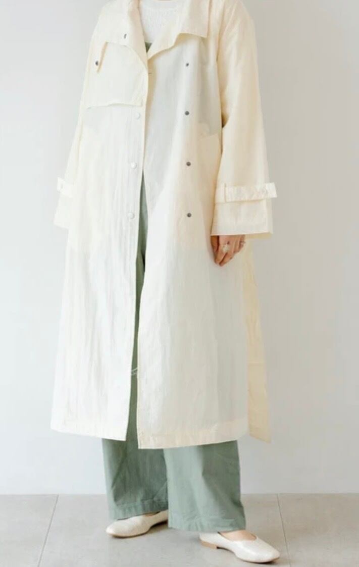 ワッシャー素材が新鮮なスタンドカラーロングコート。